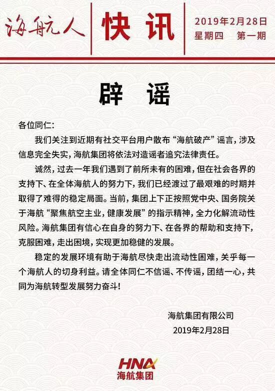 随后针对传闻,海航回应称:我们关注到近期有社交平台用户散布“海航破产”谣言,涉及信息完全失实,海航将依法对造谣者追究法律责任。
