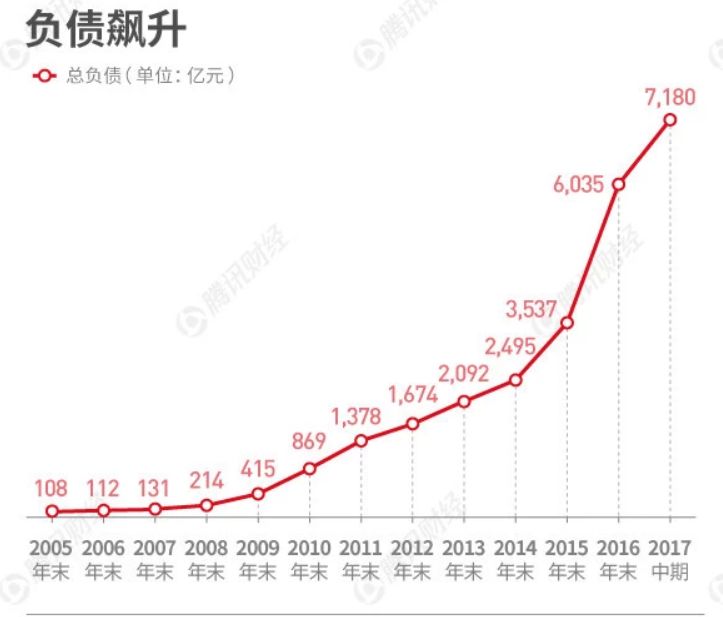 数据显示,截至2017年6月末,海航总资产为1.2万亿元,半年增加近2000亿元;与此同时,负债从2016年末的6035亿元快速上升至2017年6月末7180亿元。