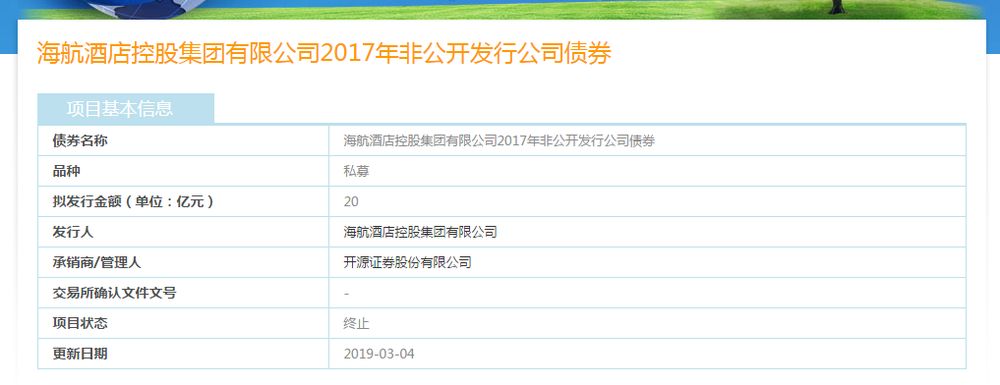 3月4日,在海航辟谣破产谣言几日后,海航酒店发行的一笔20亿元私募债被上交所终止,承销商是开源证券股份有限公司。