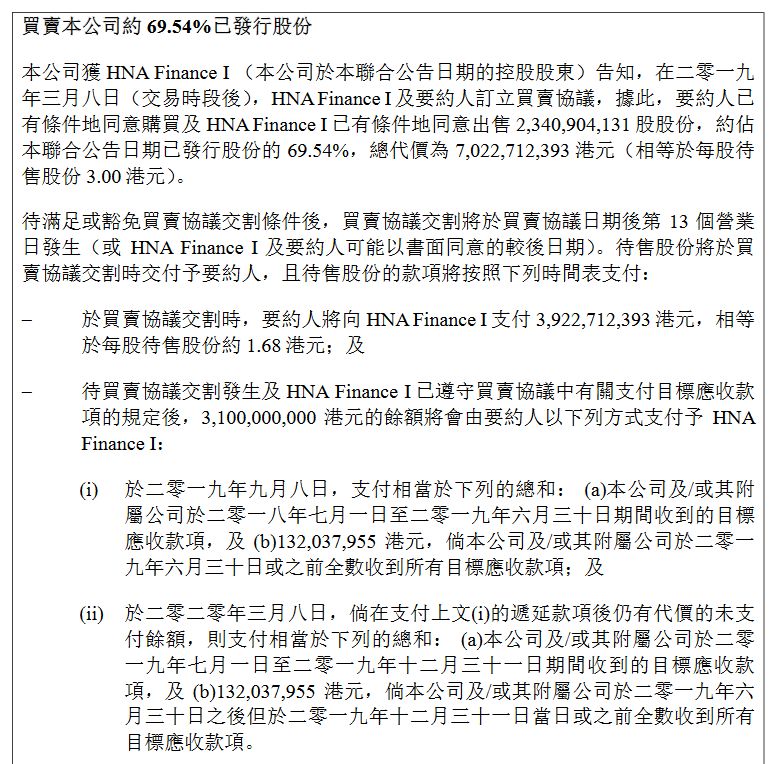 3月9日,香港国际建投发布公告称,公司获控股股东HNA Finance I告知,在2019年3月8日,HNA Finance I与要约人TIMES HOLDINGS II LIMITED签订买卖协议,同意有条件出售约23.41亿股股份,占已发行股份的69.54%,总代价约70.23亿港元。