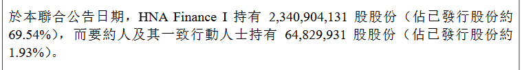 此前,HNA Finance I持有香港国际建投约23.41亿股股份,占已发行股本的69.54%;要约人及其一致行动人持有约6482.99万股股份,占已发行股本的1.93%。
