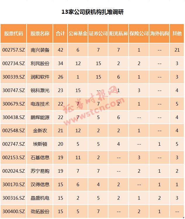从具体调研机构来看,私募朱雀投资调研了埃斯顿、新时达、分众传媒等,同犇投资调研了鹏辉能源、汉得信息;公募基金方面,博时基金调研了锐科激光、利尔化学、国光股份等,华夏基金调研了锐科激光、金新农、苏宁易购等,嘉实基金调研了润和软件、南山控股,南方基金调研了友阿股份、高乐股份、电连技术等,易方达基金调研了利民股份、鲍斯股份;海外机构方面,安联投资调研了劲拓股份,贝莱德调研了分众传媒,富敦投资调研了汉得信息,凯基证券调研了埃斯顿和晶盛机电,三星资产调研了广田集团。