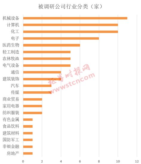 按行业分类看,上周被调研公司主要集中在机械设备、计算机和化工等3大行业,涉及公司数量分别为11家、10家和10家。