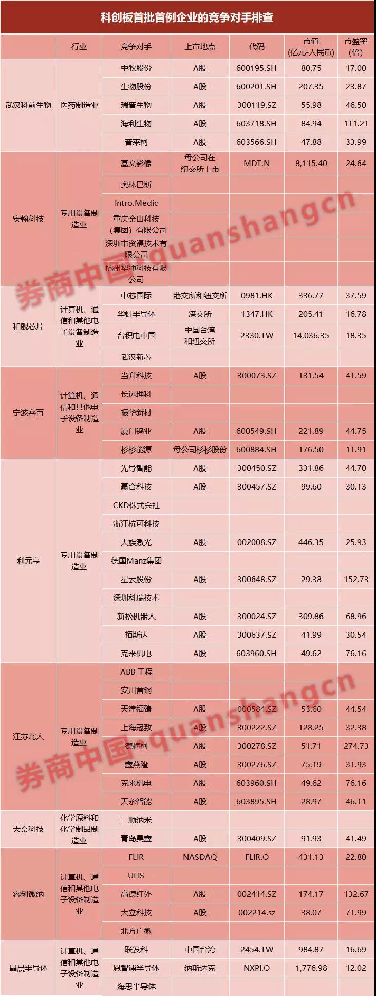 另外,这首批受理的科创板企业,大部分都能在A股上市公司中找到竞争对手,这也意味着未来两者在估值方面对标的可能性。一方面,科创板企业的估值标准会将同类公司作为参考对象,另一方面已上市的竞争对手企业估值也可能被重新审视。