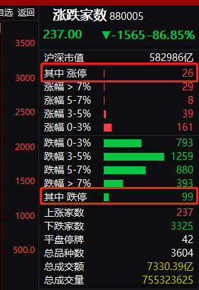 两市个股全线下跌,下跌个股达3325只,上涨个股仅237只,跌停个股数量达99只,上涨个股仅有26只。