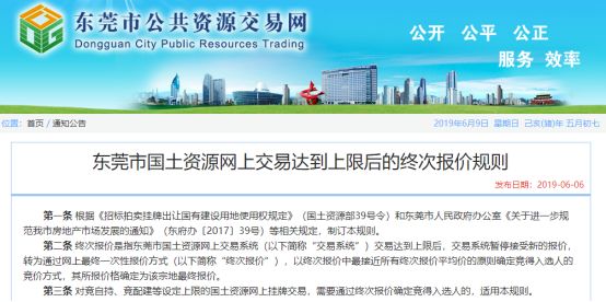 6月6日,东莞市公共资源交易网发布国土资源网上交易达到上限后的终次报价规则。