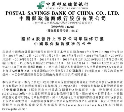 邮储银行晚间公告称,该行已于近日收到《中国银保监会关于邮储银行首次公开发行A股股票并上市和修改公司章程的批复》。