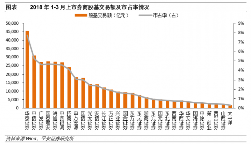 从分券商情况看,1-3月股基交易量市占率居首的券商依然是华泰证券(交易额16995亿元,市场份额7.8%),第二、三名分别是中信证券和广发证券,市场地位基本稳固。