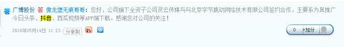 广博股份(002103)公开回应:公司旗下全资子公司灵云传媒与北京字节跳动网络技术有限公司签约合作,主要系为其推广今日头条、抖音、西瓜视频等APP端下载。
