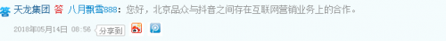 天龙集团(300063)则表示,北京品众与抖音之间存在互联网营销业务上的合作。