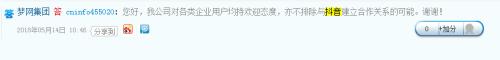 另外,梦网集团(002123)表达了相关合作“心愿”,“公司对各类企业用户均持欢迎态度,亦不排除与抖音建立合作关系的可能”。