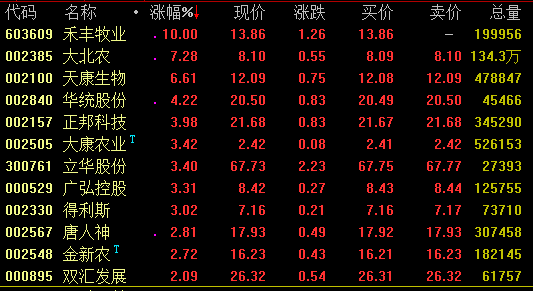 猪肉概念23日早盘再度大幅拉升,截至发稿,禾丰牧业涨停,大北农涨逾7%,天康生物涨幅超6%,华统股份、正邦科技、大康农业、立华股份等涨幅超3%。