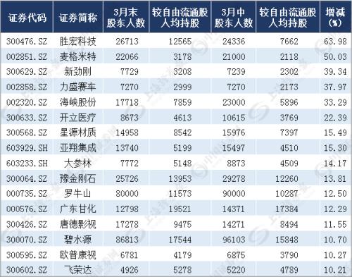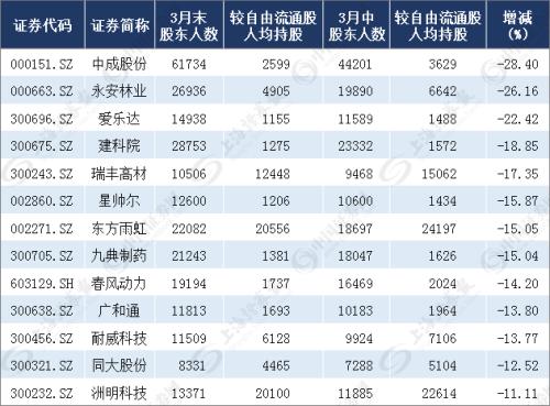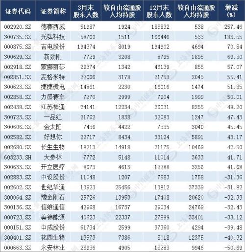 如果以3月末人均持股数跟去年12月末进行比较,则42只个股增超20%,15只个股增超40%(见下表),德赛西威(002920)(257.46%)、光弘科技(300735)(183.55%)以逾100%的增持比例居前;29只个股人均持股减少幅度超过了10%,8只个股减超30%(见下表),永安林业(-50.69%)、花园生物(300401)(-40.32%)以逾40%的人均减持比例居前。