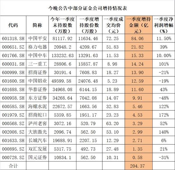 中国基金报记者不完全统计的15家今晚披露季报的上市公司,证金公司已经增持204亿元,其中增持中国平安金额最大,高达84亿元;增持格力电器、中国中车、三一重工、招商证券、中国铝业、华泰证券的市值也超过10亿元。