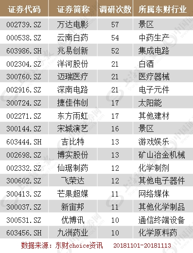 特别需要提醒的是,11月前半个月,有3家公司可谓被调研“明星”。万达电影、云南白药、兆易创新被调研的次数分别达到57次、54次和52次,成为公募基金最为追捧的3家公司。