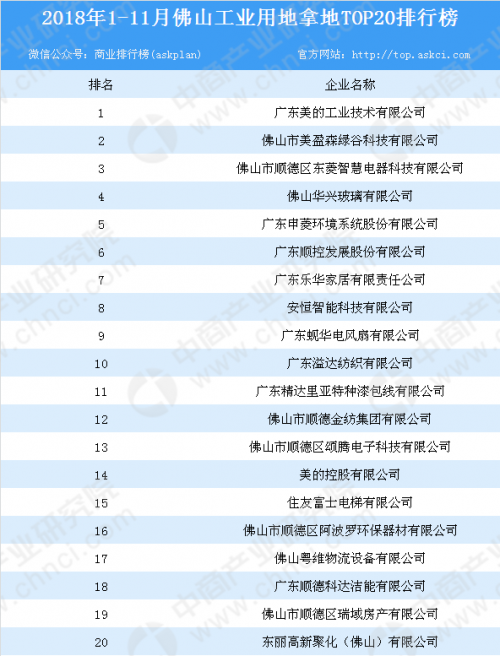 产业地产情报:2018年1-11月佛山工业用地拿地排行榜(TOP20)