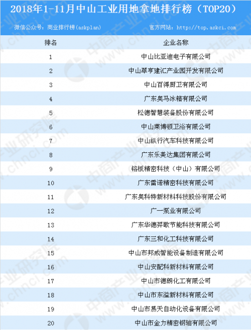 产业地产情报:2018年1-11月中山工业用地拿地排行榜(TOP20)