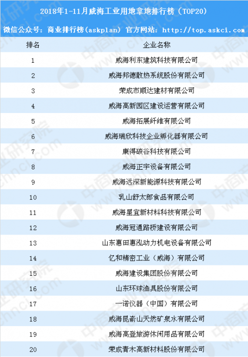 产业地产情报:2018年1-11月威海工业用地拿地排行榜(TOP20)