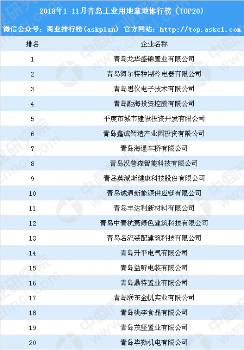 产业地产情报:2018年1-11月青岛工业用地拿地排行榜(TOP20)