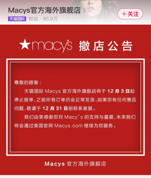 日前,天猫国际梅西百货官方海外旗舰店发布撤店公告称,12月3日起停止接单,该日之前所有订单仍会正常发货,梅西百货未来将通过美国官网继续服务。