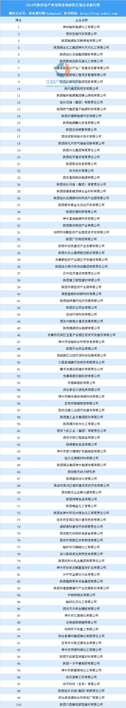 2018年陕西产业用地拿地面积百强企业榜单前十企业分别为神华榆林能源化工有限公司、西安宝能汽车有限公司、陕西能源赵石畔煤电有限公司、陕西煤业化工集团神木天元化工有限公司、陕西延长石油集团橡胶有限公司、陕西智诚运势石油化工有限公司、安康高新新兴产业厂房建设运营有限公司、陕西西建新城工程项目管理有限公司、陕西必康制药集团控股有限公司、陕汽集团商用车有限公司。