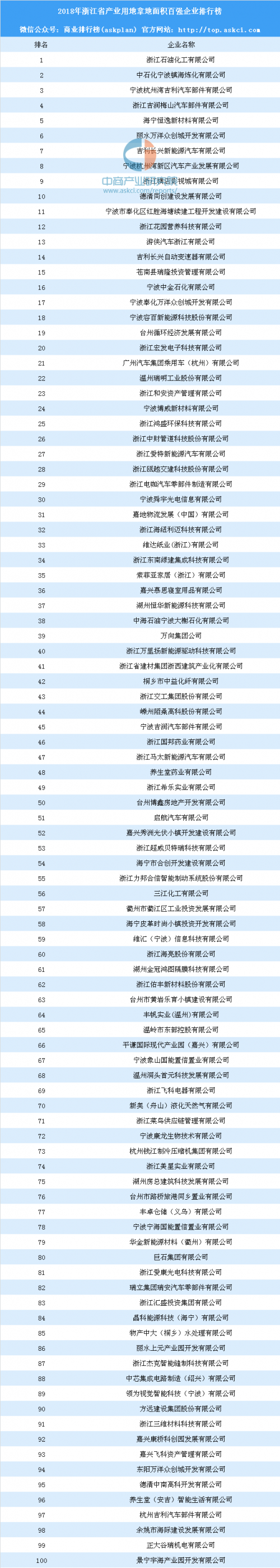产业用地情报:2018年浙江省产业用地拿地面积百强企业排行榜