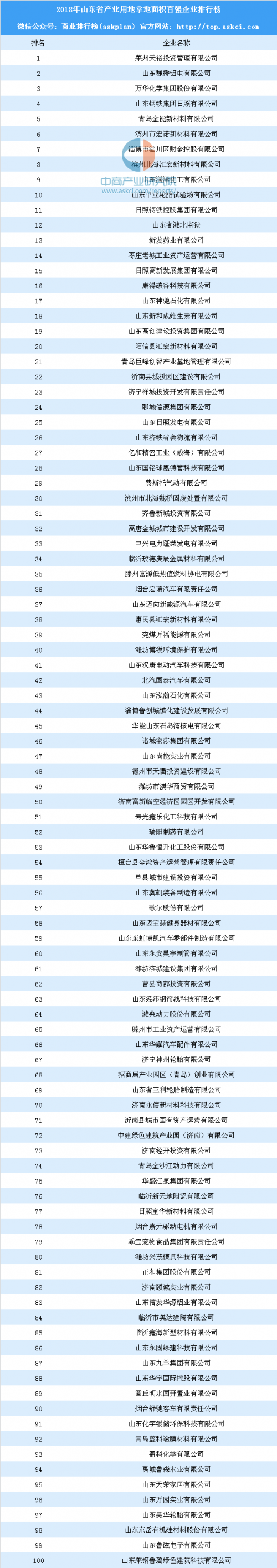 产业用地情报:2018年山东省产业用地拿地面积百强企业排行榜