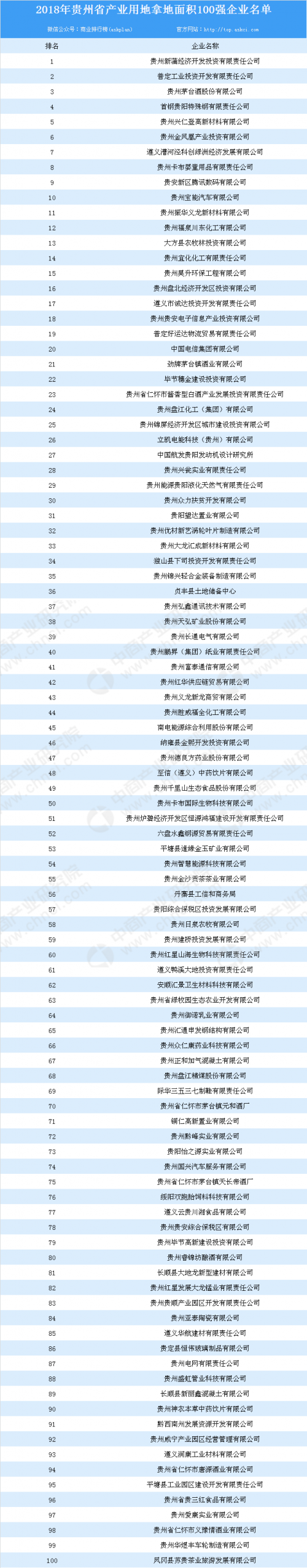 产业用地情报:2018年贵州省产业用地拿地面积100强企业排行榜