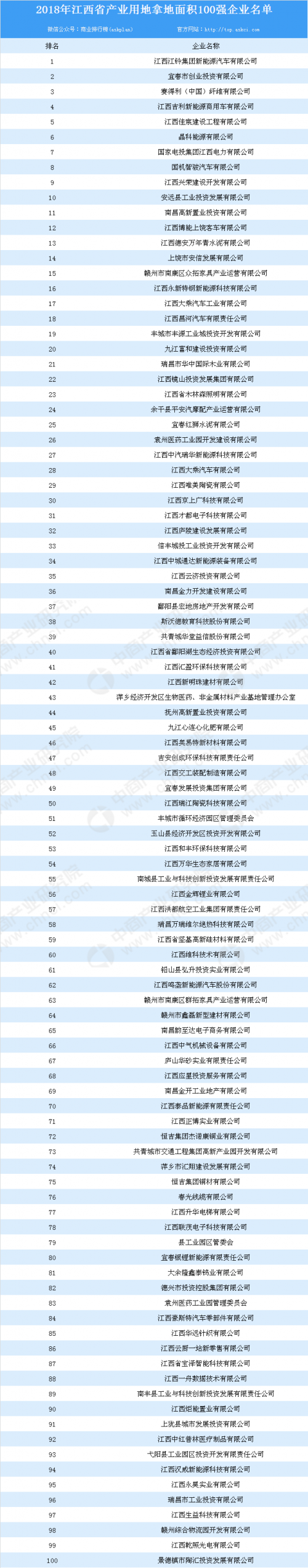产业用地情报:2018年江西省产业用地拿地面积100强企业排行榜