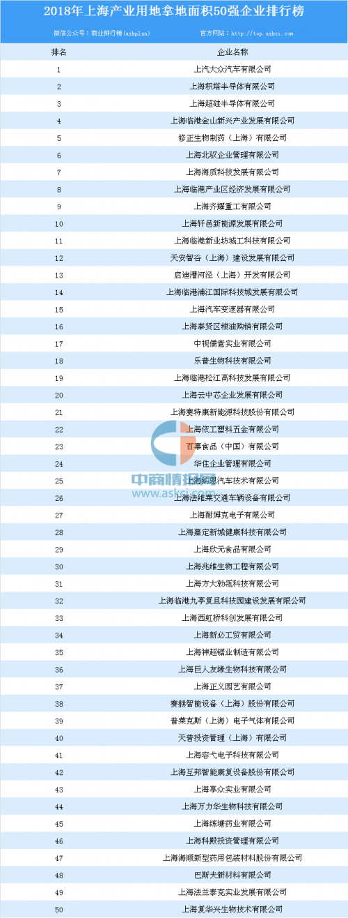 产业用地情报:2018年上海产业用地拿地面积50强企业排行榜