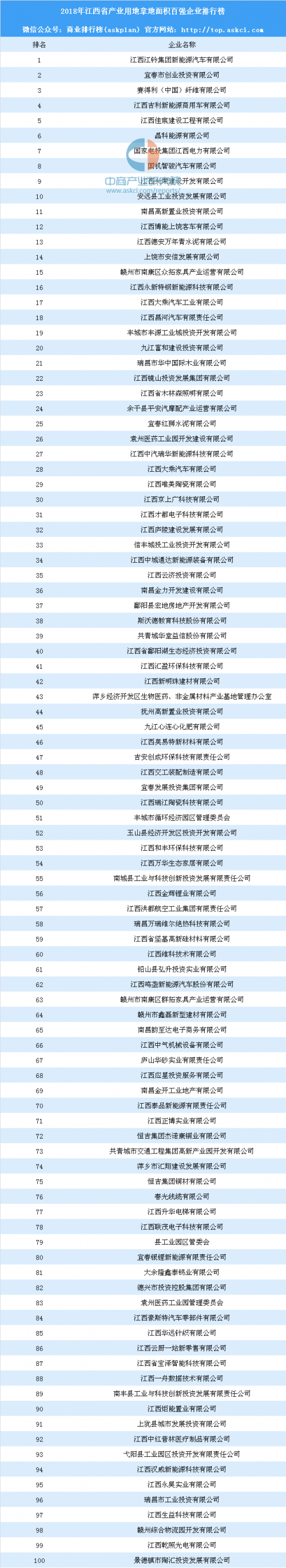 2018年江西产业用地拿地面积百强企业榜单前十分别为:江西江铃集团新能源汽车有限公司、宜春市创业投资有限公司、赛得利(中国)纤维有限公司、江西吉利新能源商用车有限公司、江西佳宸建设工程有限公司、晶科能源有限公司、国家电投集团江西电力有限公司、国机智骏汽车有限公司、江西兴荣建设开发有限公司、安远县工业投资发展有限公司。