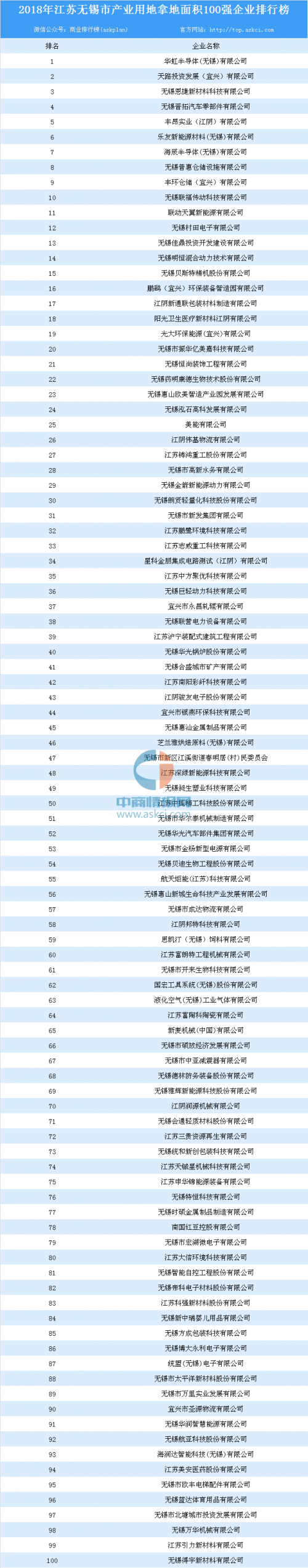 产业用地情报:2018年江苏省无锡市产业用地拿地面积100强企业排行榜