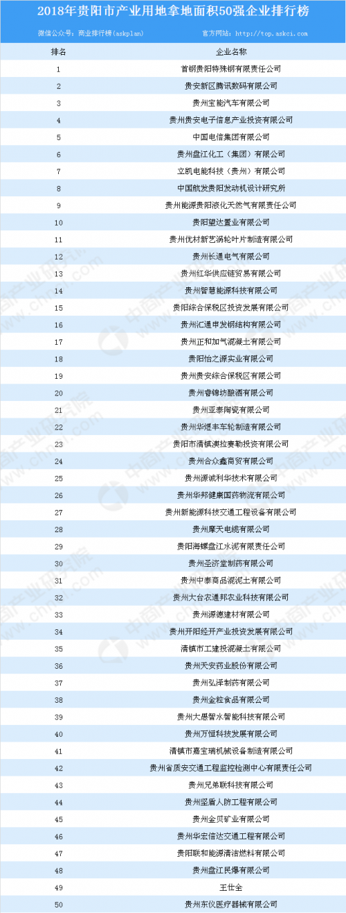 产业用地情报:2018年贵阳产业用地拿地面积50强企业排行榜