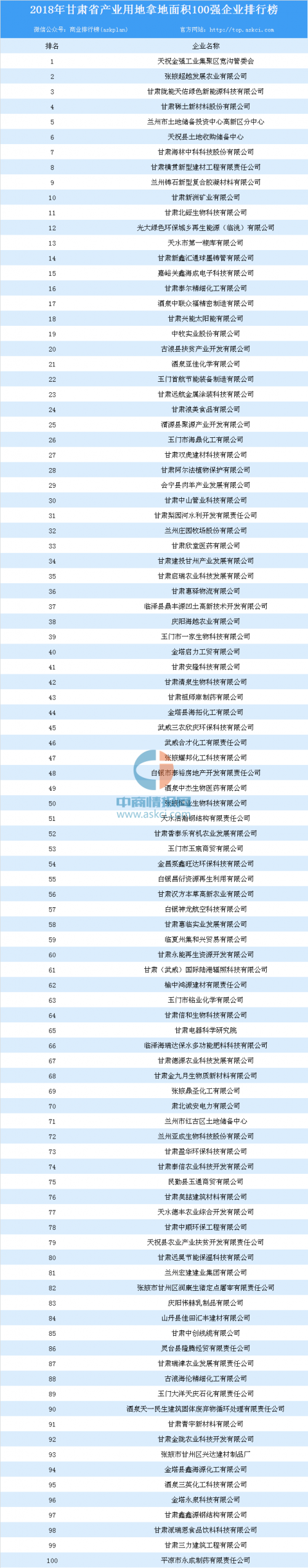 产业用地情报:2018年甘肃省产业用地拿地面积100强企业排行榜