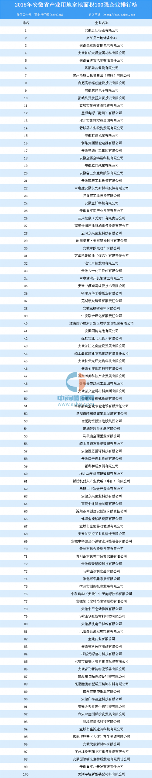 产业用地情报:2018年安徽省产业用地拿地面积100强企业排行榜