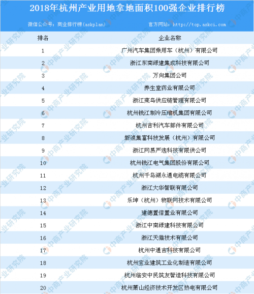 产业地产情报:2018年浙江省杭州市产业用地拿地面积100强企业排行榜