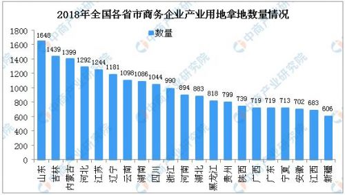 从企业产业用地拿地数量来看,2018年全国各省市商务企业产业用地拿地数量共22754宗,其中,山东商务企业产业用地拿地数量最多,共计1648宗,产业用地拿地超过1000家企业的省市共9个,分别为山东、吉林、内蒙古、河北、江苏、辽宁、云南、湖南、四川;产业用地拿地超过1500宗企业的省市仅1个。