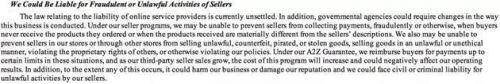 在2018年财报的“风险因素”一栏中,亚马逊提到了很多风险,包括市场竞争、经营压力、投资、库存等等,但最后一项这样写道:公司可能会为商家的欺诈等违法行为负责。