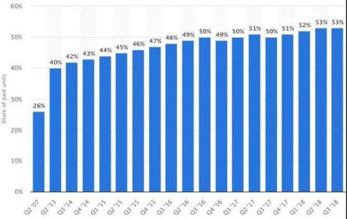 根据Statista统计数据显示,从2013年二季度到2018年三季度,亚马逊平台第三方卖家销量占比从40%增长到了53%。