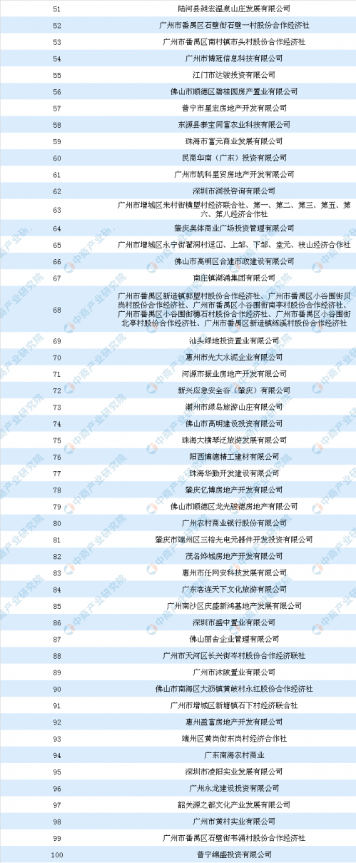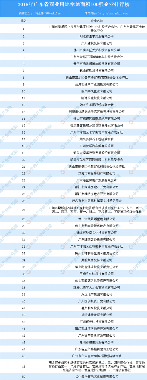 据榜单显示,2018年广东省商业用地拿地面积百强企业榜单前十名分别为:广州市番禺区小谷围街北亭村等16个村经济合作社/广州市番禺区土地开发中心、阳江市壹丰实业有限公司、广州建筑股份有限公司、佛山市南海区天元和投资有限公司、广州市增城区石滩镇麻车村经济联合社、开平市赤坎旧埠旅游发展有限公司、鹤山市融川投资有限公司、佛山市三水区云东海街道何家股份合作经济社、汕尾市红草产业园投资有限公司以及韶关鸿硕置业有限公司。前十企业商业用地拿地共计528.7公顷,占100强企业总面积的49.7%,近半壁江山。