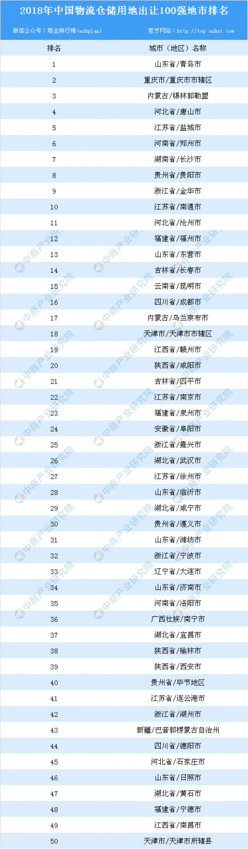 物流地产投资情报:2018年中国物流仓储用地出让100强地市排名