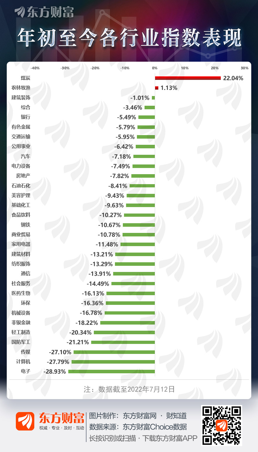 数据显示,年初至今,申万31个行业中,仅煤炭和农林牧渔行业年内收涨,涨幅分别为22.04%和1.13%。其中,煤炭行业今年表现可谓一骑绝尘,遥遥领先其他行业板块。中信证券表示,上半年煤价同比上涨超过50%,上市公司业绩同比增长超过90%。展望下半年,虽然短期市场对后续景气预期有分歧,但短期负面预期或已逐步消化,中报业绩预期或催化新一轮行情,建议关注煤炭板块低估值公司。