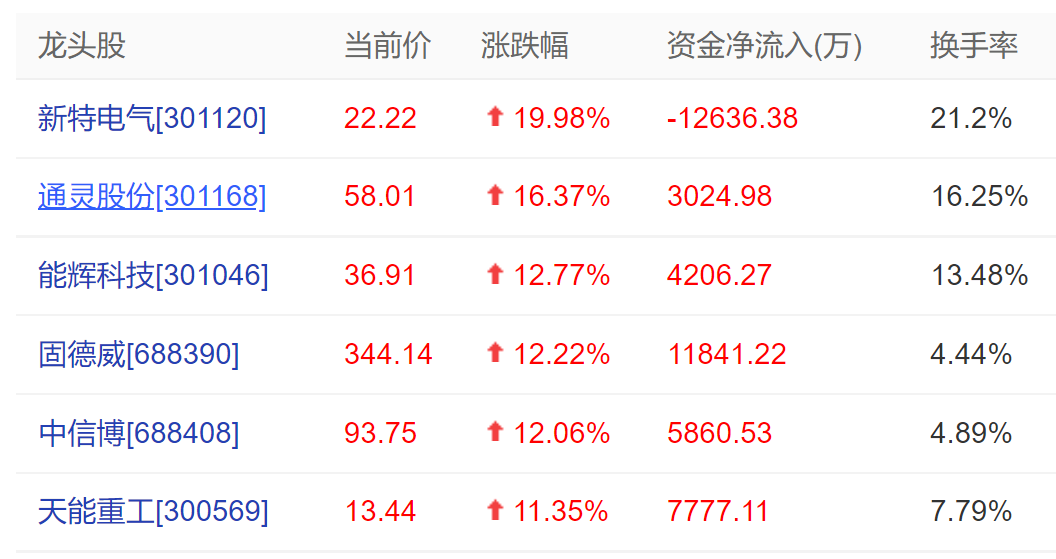 板块个股中,涨幅较大的个股为:新特电气报22.22元,涨19.98%;通灵股份报58.01元,涨16.37%;固德威报344.14元,涨12.22%;中信博报93.75元,涨12.06%;天能重工报13.44元,涨11.35%。